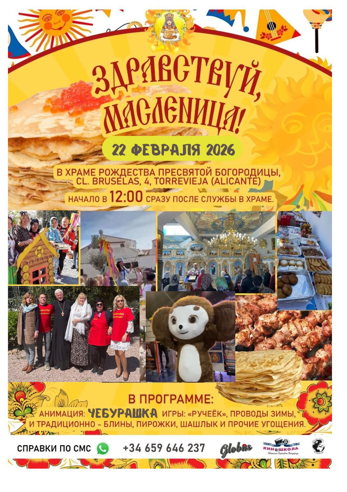 Подготовили развлекательную программу педагоги и ученики общеобразовательной школы номер 1 города Торревьехи. Примут участие представители карнавального шествия нашего города - самые красивые и яркие! Многие не знают, что Карнавал и Масленица имеют общие истоки - празднование перед Великим Постом. Об этом расскажет на Проповеди Митрофорный Протоирей Ярослав Дибач . Гвоздем программы будет огромный Чебурашка, который споет и станцует вместе с нами! А еще мы ждём гостей из города Дении с театральным представлением!